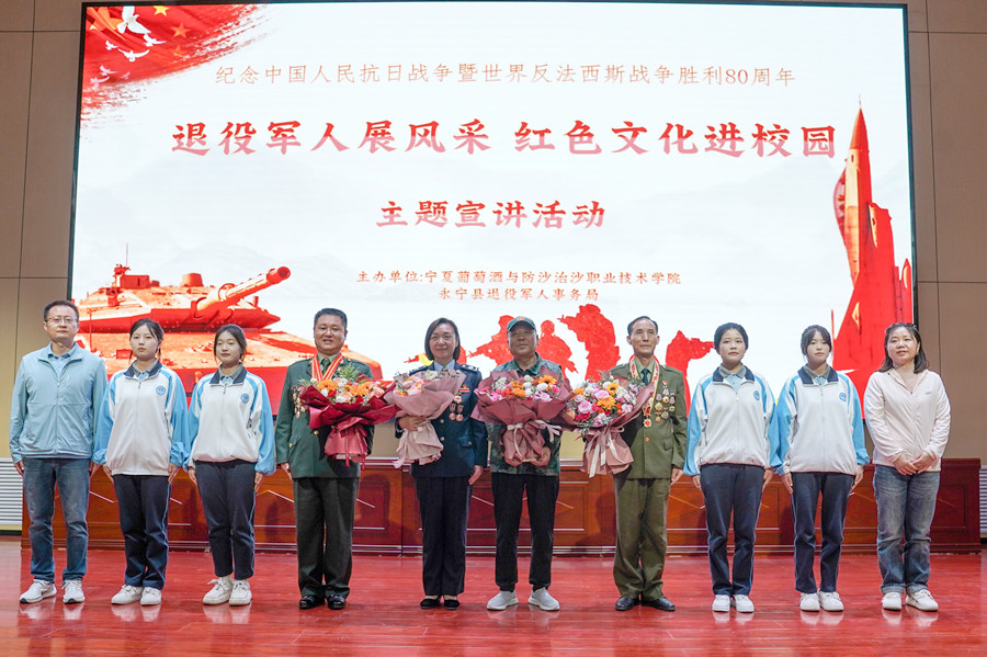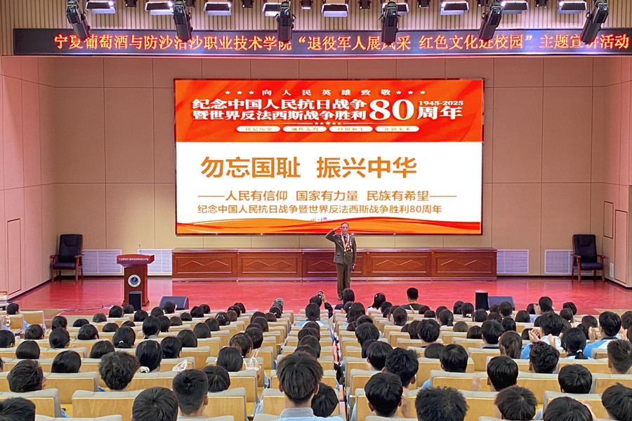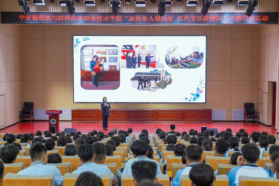 9月16日下午,永宁县退役军人事务局联合宁夏葡萄酒与防沙治沙职业技术学院共同举办“退役军人展风采 红色文化进校园”主题宣讲活动。永宁县退役军人事务局工作人员、宁夏老兵宣讲团成员蔡国、王欢、王瑛、张光彦和学院学生工作部全体工作人员以及350名师生代表参加活动。