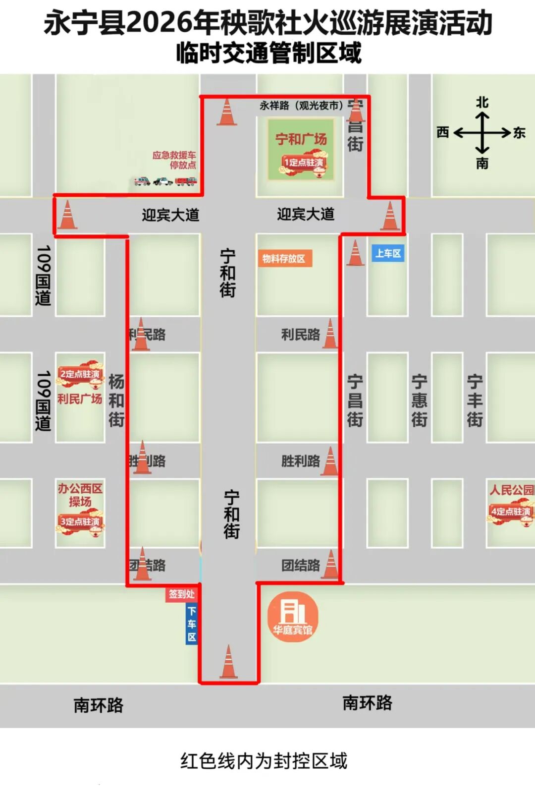 2026年元宵节将至,为深入贯彻落实习近平新时代中国特色社会主义思想,深入挖掘传统节日的文化内涵,展现永宁县经济社会发展成果,营造欢乐、喜庆、祥和的节日氛围。我县定于2026年3月3日(正月十五)8:30在永宁县城举办永宁县2026年秧歌社火巡游展演活动。为确保正月十五永宁县社火巡演期间道路交通安全有序,根据《中华人民共和国道路交通安全法》相关规定,决定在巡演期间对辖区部分道路实施临时道路交通管制,现就有关事项通告如下: