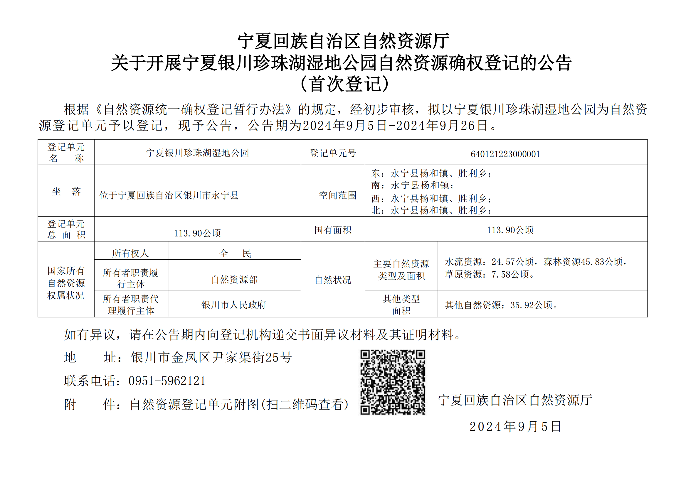 宁夏回族自治区自然资源厅关于开展宁夏银川珍珠湖湿地公园自然资源确权登记的公告 (首次登记)