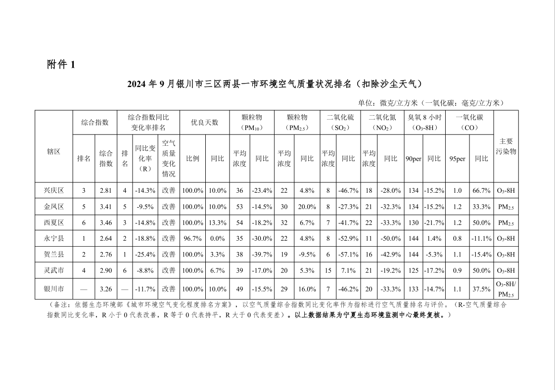 2024年9月银川市三区、两县一市环境空气质量排名