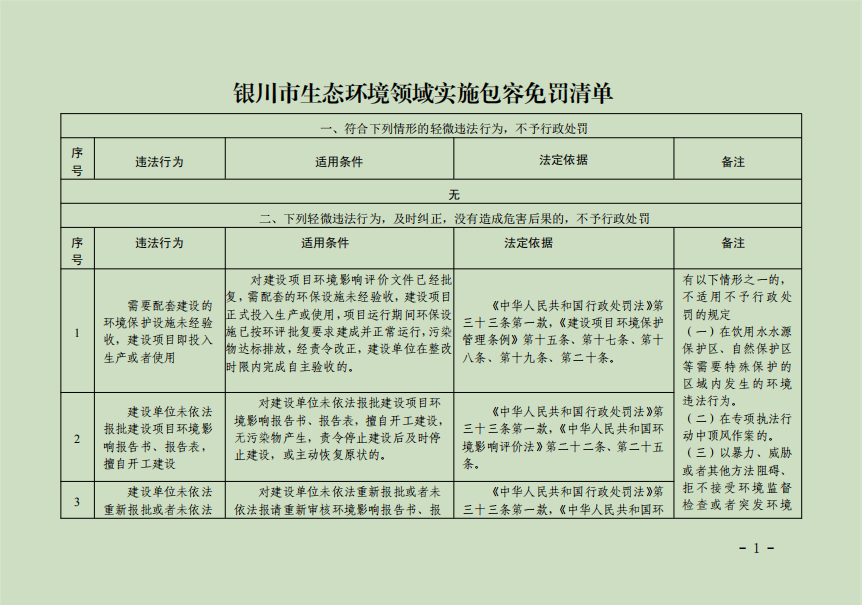 银川市生态环境领域实施包容免罚清单