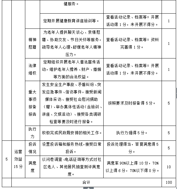 第十七条县民政局根据自治区民政厅下达运营补助资金情况,结合评估结果统筹使用运营补助资金。评估按照百分制打分,对评估等次在80分及以上且每年运营8个月及以上的社区老年人日间照料中心予以补助,不足部分由乡镇(街道)自行筹措资金解决。经评估在80分以下的社区老年人日间照料中心,取消当年运营补贴,并做整改检查。