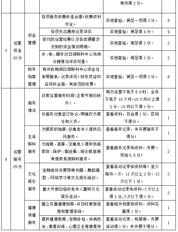 第十七条县民政局根据自治区民政厅下达运营补助资金情况,结合评估结果统筹使用运营补助资金。评估按照百分制打分,对评估等次在80分及以上且每年运营8个月及以上的社区老年人日间照料中心予以补助,不足部分由乡镇(街道)自行筹措资金解决。经评估在80分以下的社区老年人日间照料中心,取消当年运营补贴,并做整改检查。