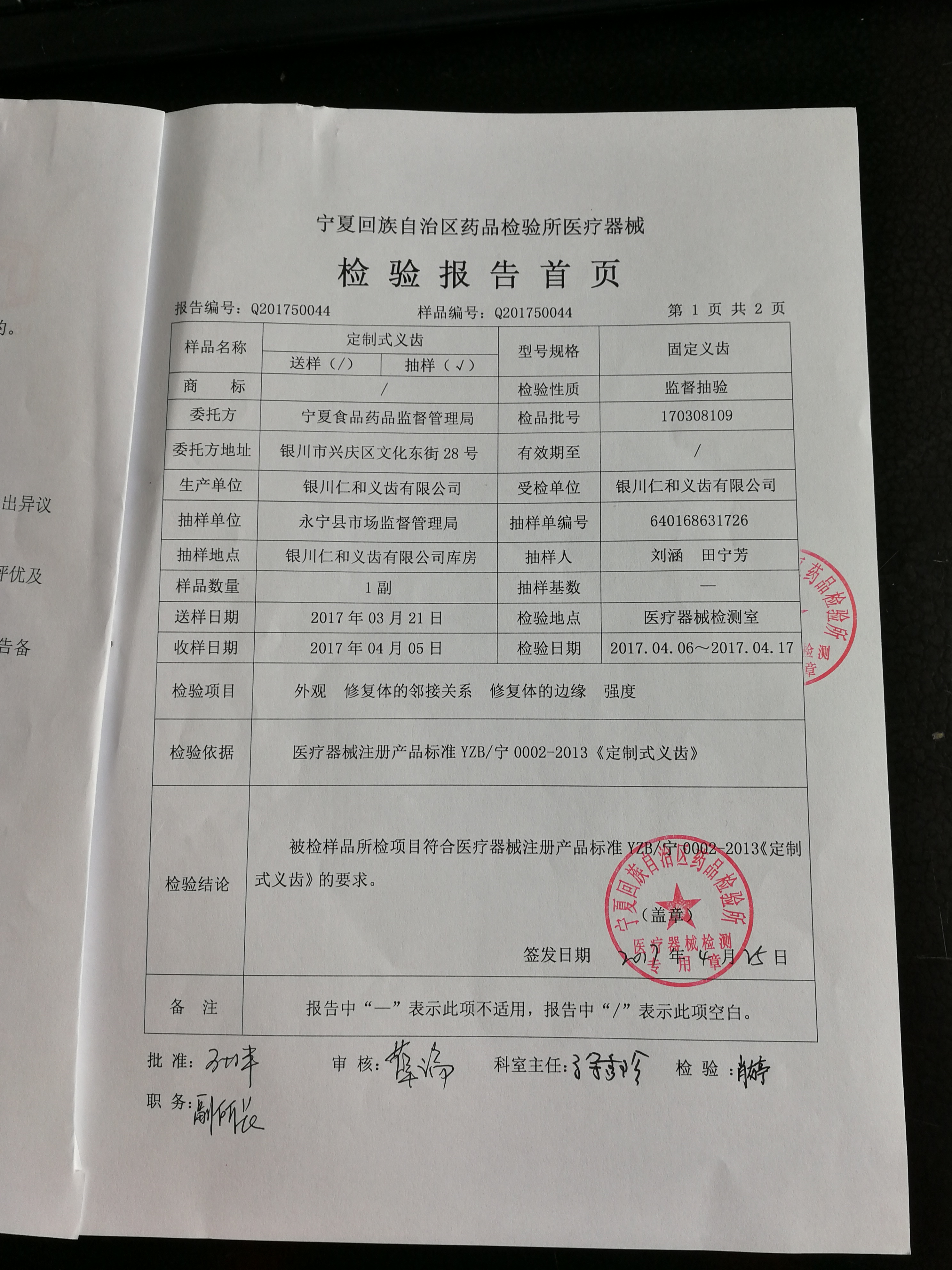 银川仁和义齿有限公司,生产的定制式义齿,型号规格固定义齿,检品批号170308109,经宁夏回族自治区药品检验所医疗器械检验,结果符合标准。(见附件)