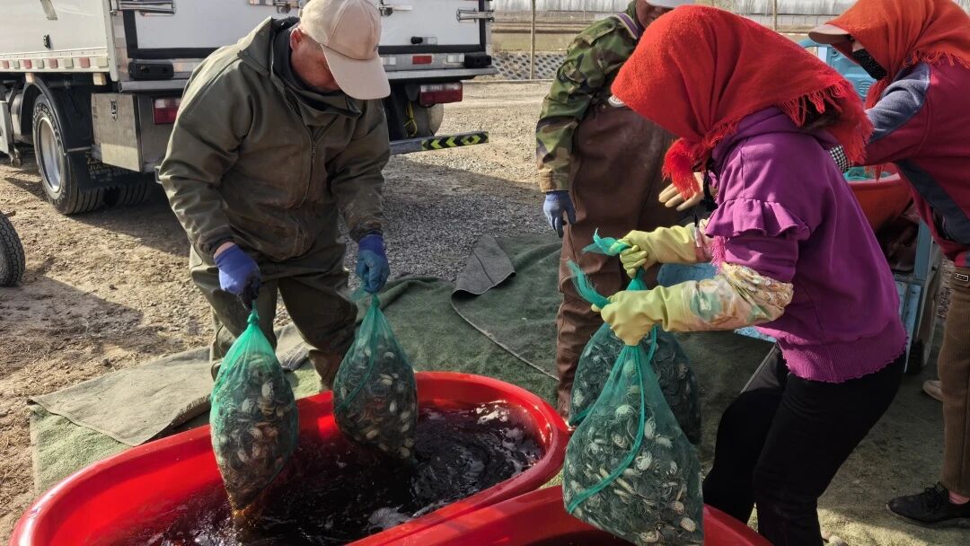 “今天我们投放的是中华绒螯蟹,这种蟹苗品质优、长势旺,养成后每只重量可达三两左右,预计今年9月初即可收获上市。”宁夏航拓农业科技发展有限公司负责人冯文静介绍。投苗环节看似简单,实则大有讲究,每一步都需精细操作,才能有效提高蟹苗成活率。养殖基地内,连片的池塘波光粼粼、澄澈见底,养殖户们小心翼翼地将一袋袋蟹苗从塑料筐中取出,放入旁边的大水盆中浸润。待蟹苗充分适应水体环境后,工作人员分工协作,有序将水盆中的蟹苗搬运至车上。随着编织袋被缓缓剪开,一兜兜鲜活的小蟹苗你争我抢、张牙舞爪地爬进水塘,开启了水下生长之旅。