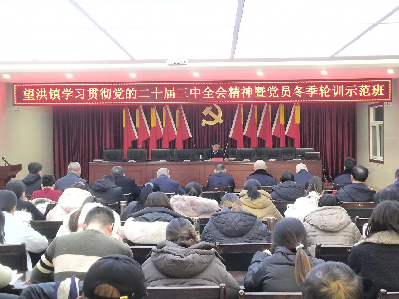 “组织+指导”,助力冬训 “稳推进”。望洪镇紧扣新时代农村党员教育培训新任务、新要求,坚持强基固本、守正创新、务求实效,制定印发《望洪镇2024年党员冬季轮训实施方案》《关于举办望洪镇学习贯彻党的二十届三中全会精神暨党员冬季轮训示范班的通知》,第一时间召开动员会议进行安排部署,蓄力按下党员冬季轮训“启动键”。在镇党校举办集中培训示范班,通过邀请老师进行专题讲座、领导班子进行专业领域专题授课、观看红色教育视频等形式,做好开篇引导示范。同时,指导各党支部通过微信群、电话、腾讯会议等形式广发“动员令”,全面吹响党员冬训“集结号”。