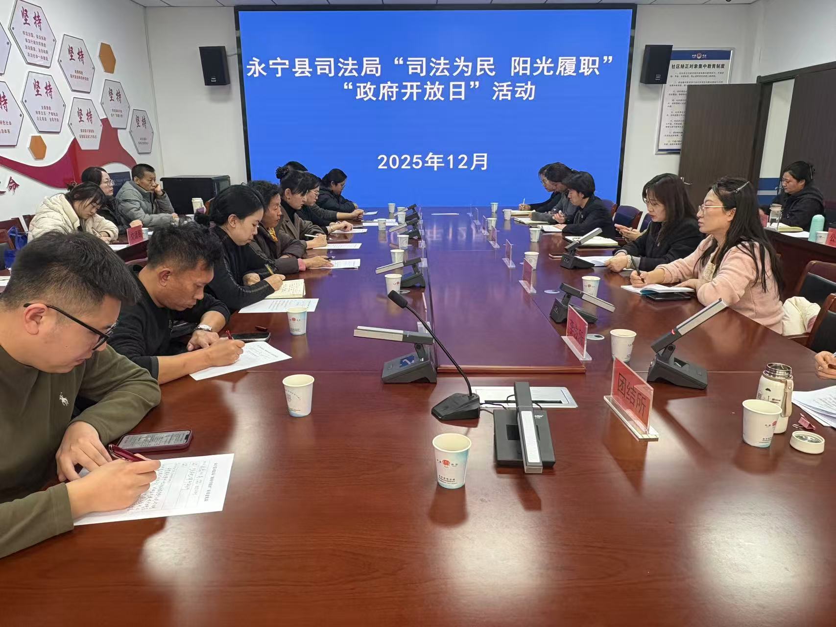 为深入践行“司法为民”服务宗旨,切实提升司法行政工作透明度和公信力,12月18日,永宁县司法局开展以“司法为民 阳光履职”为主题的“政府开放日”活动。活动邀请县人大代表、县政协委员、县检察院工作人员、行政执法人员、行政执法监督员、行政复议委员会委员及辖区群众代表等40余人齐聚一堂,零距离触摸司法行政工作的时代“脉搏”,亲身感受法治建设的“温度”与“力度”。